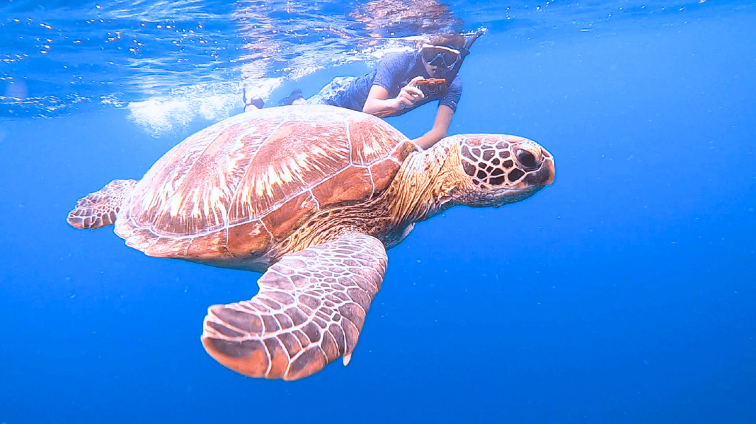 生態系を壊さないようツアーを催行しておりますので、ウミガメを無理やり引っ張ってきてお見せたりはしておりません。